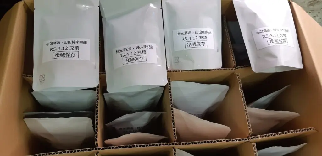 現在、出来上がった商品を冷蔵と常温で保管中です。新しい取り組みにつき、パウチ袋を使用することによる日本酒の品質の経過を調べる方向です。