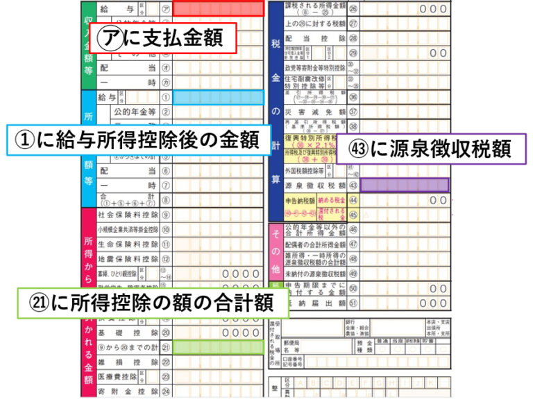 これで源泉徴収票に記載されている給与の額、控除の額、源泉徴収された額が転記されたことになります。